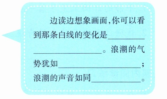 2. 课文中有很多生动的语句,用“___”在文中画出你喜欢的语句,再有感情地朗读,想象画面,感受大潮的变化和雄伟气势。(考查点:语文要素)