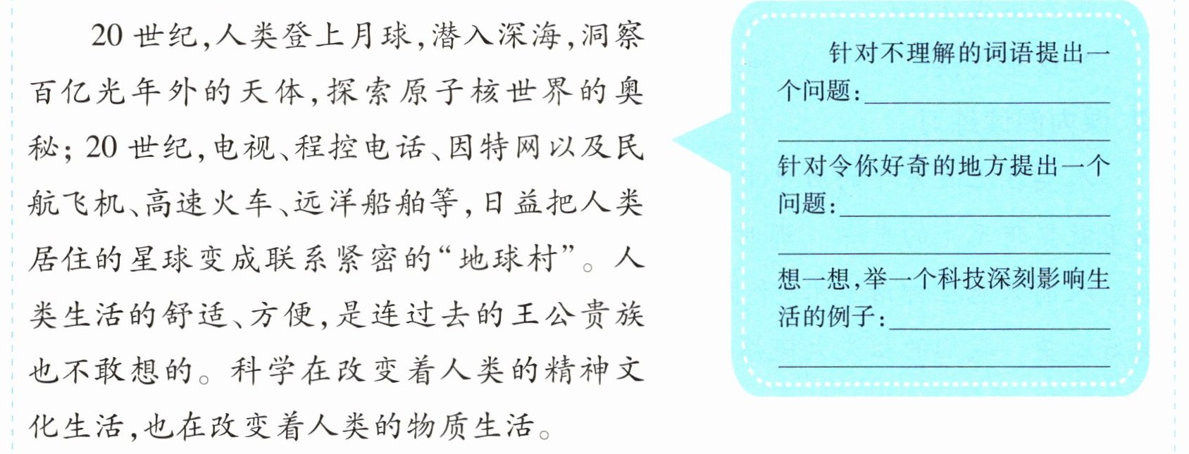想一想,举一个科技深刻影响生活的例子:互联网的普及,让购物、学习、交流变得更加方便快捷。