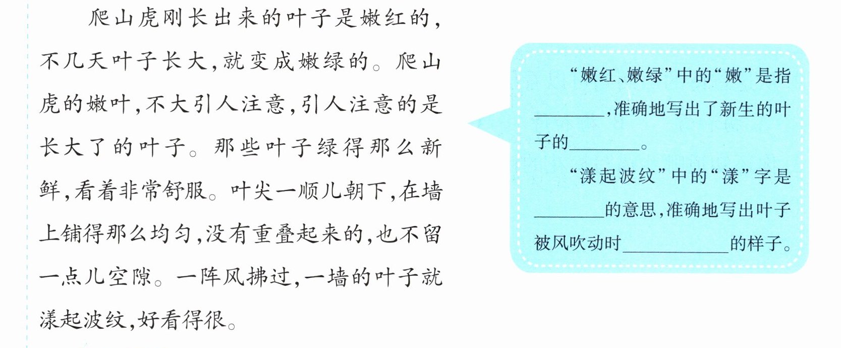 @@答题:1. ﹏“爬山虎刚长出来的叶子是嫩红的,不几天叶子长大,就变成嫩绿的。”﹏2. ﹏“以前,我只知道这种植物叫爬山虎,可不知道它怎么能爬。今年,我注意了,原来爬山虎是有脚的。”﹏3. ﹏“爬山虎的脚要是没触着墙,不几天就萎了,后来连痕迹也没有了。”﹏4. ﹏“不要瞧不起那些灰色的脚,那些脚巴在墙上相当牢固,要是你的手指不费一点儿劲,休想拉下爬山虎的一根茎。”﹏