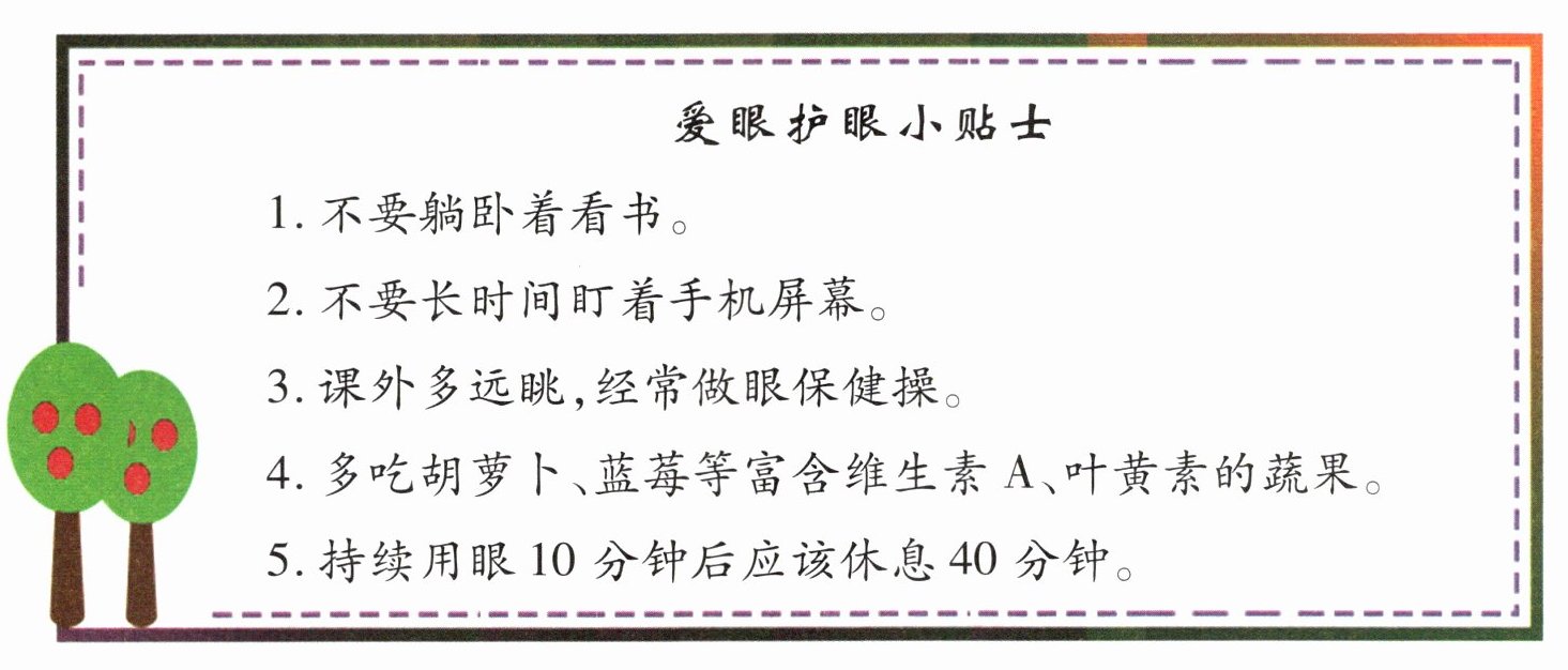 。(3分)2. 小组成员制作了“爱眼护眼小贴士”的海报。有一项建议不恰当,请你在句子上改正。(3分)