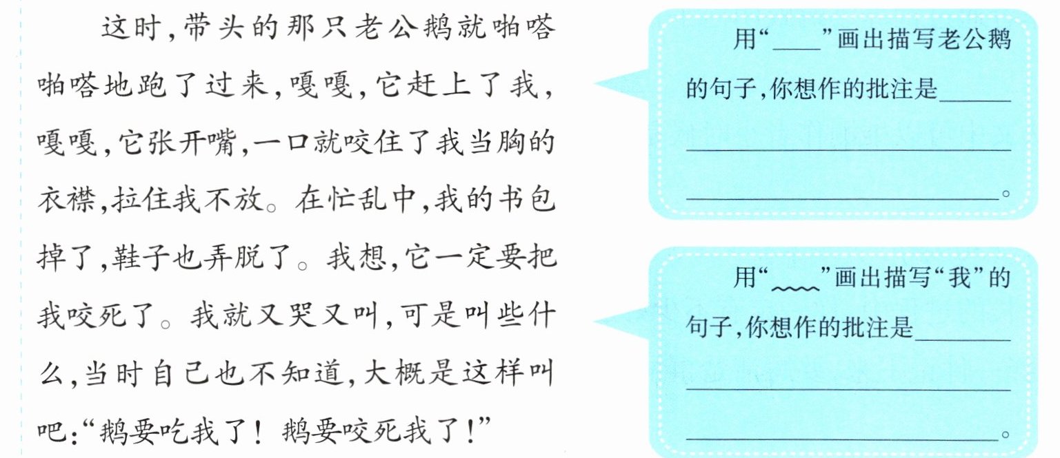 批注:通过动作和叫声描写,表现出老公鹅的凶猛。
