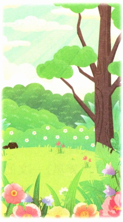 树林中开满了五颜六色的花朵,遍地是绿色的小草,小刺猬在地上滚来滚去,狗熊从地上爬起来伸了个懒腰。