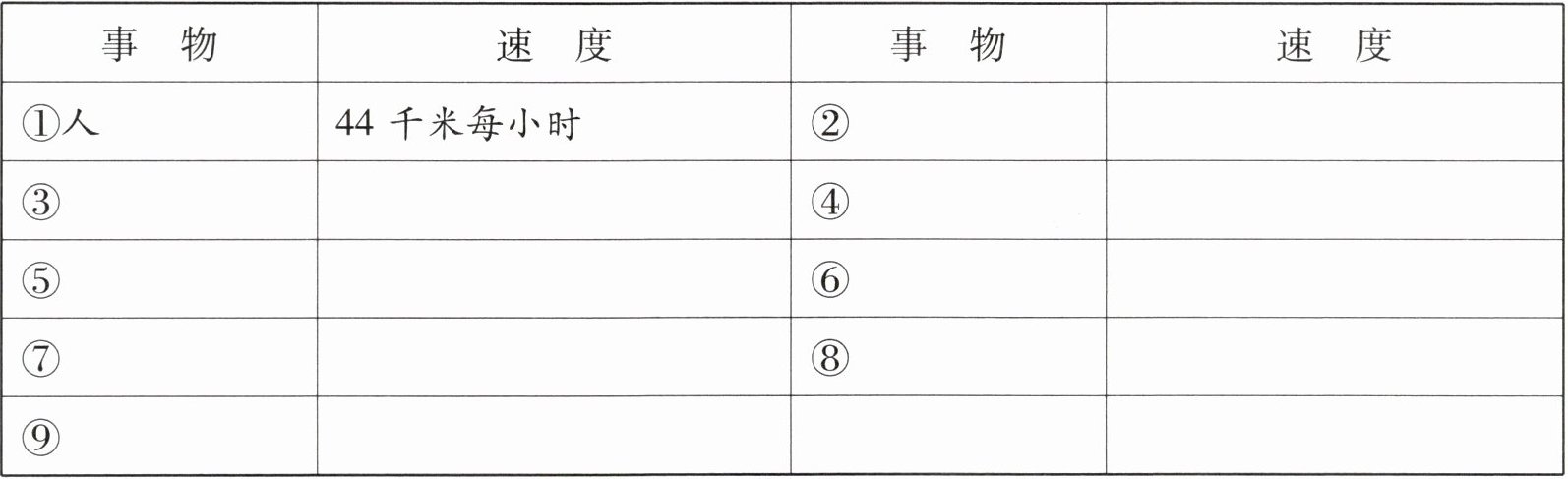 ②鸵鸟 约72千米每小时 ③猎豹 110千米每小时 ④游隼 超过320千米每小时 ⑤声音 在喷气式飞机飞行的高度,速度大约是1050千米每小时 ⑥高速喷气式飞机 是声速的数倍 ⑦火箭 4万千米每小时 ⑧流星体 25万千米每小时 ⑨光 大约30万千米每秒