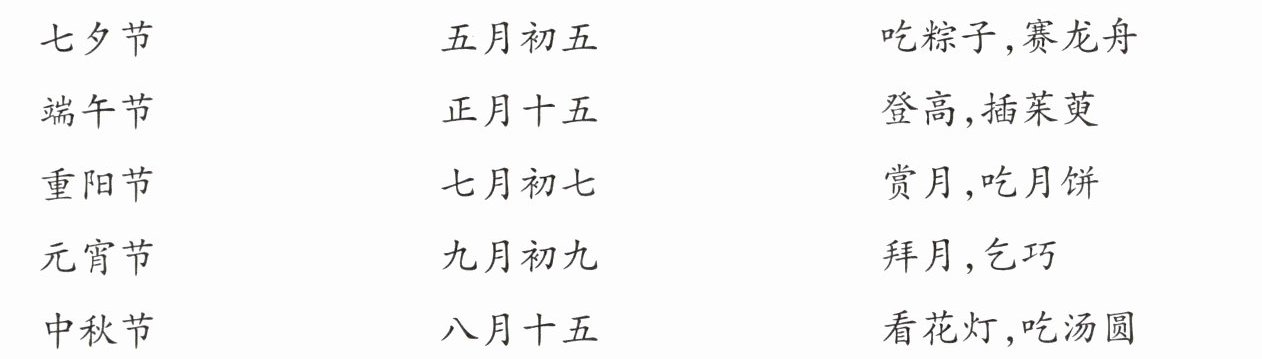 (从左到右,自上而下)七夕节——七月初七——拜月,乞巧;端午节——五月初五——吃粽子,赛龙舟;重阳节——九月初九——登高,插茱萸;元宵节——正月十五——看花灯,吃汤圆;中秋节——八月十五——赏月,吃月饼 。(由于题目要求是连线形式,这里以文字表述对应关系)