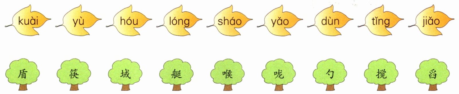 kuài—筷;yù—域;hóu—喉;lóng—咙;sháo—勺;yǎo—舀;dùn—盾;tǐng—艇;jiǎo—搅