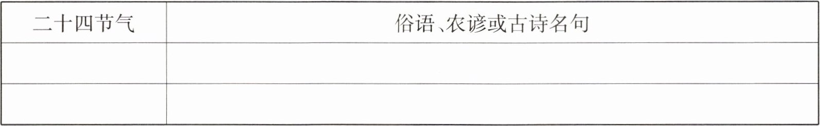 二十四节气能反映季节的变化,指导农事活动,还影响着千家万户的衣食住行。请你从二十四节气中任选两个节气各写一条俗语、农谚或古诗名句,填在下面的表格内。