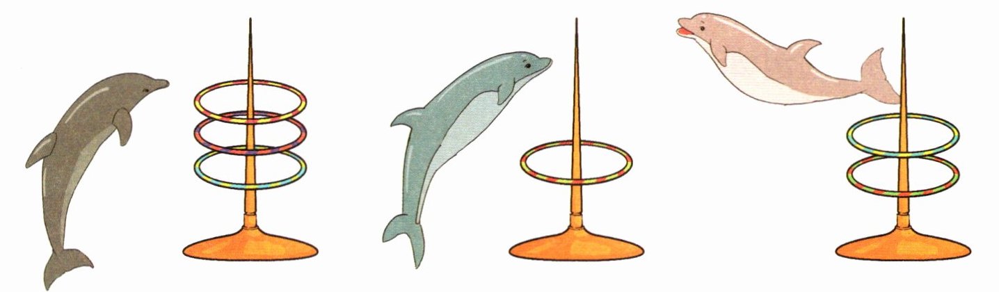 4. 每只小海豚都套了4个圈,它们各自有几个没套中?