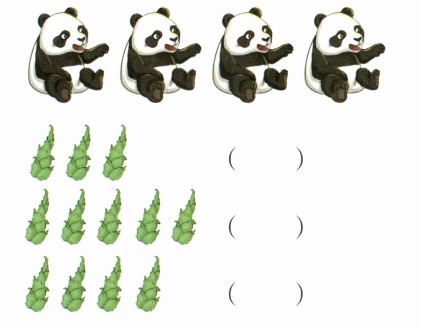 1. 有 4 只熊猫,3 堆竹笋。如果每只熊猫吃一根竹笋,挑哪一堆竹笋比较合适呢?在合适的那堆后面打“√”。(2 分)