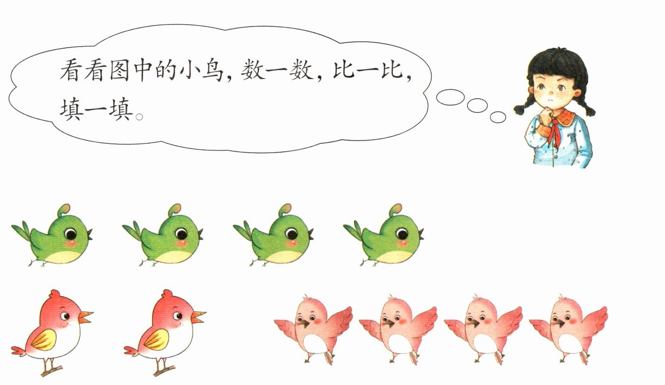 面向右边的有( )只小鸟,上边的小鸟只数比下边的少( )只。