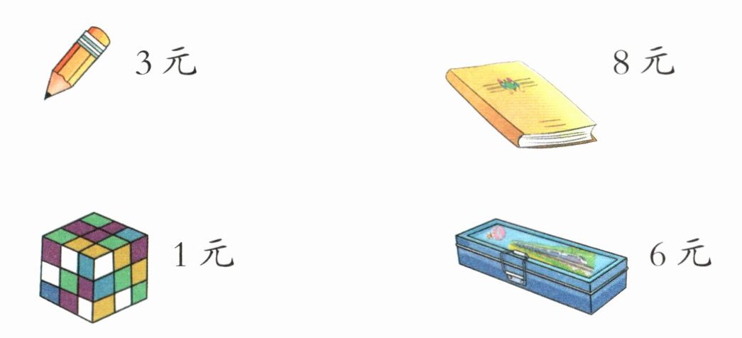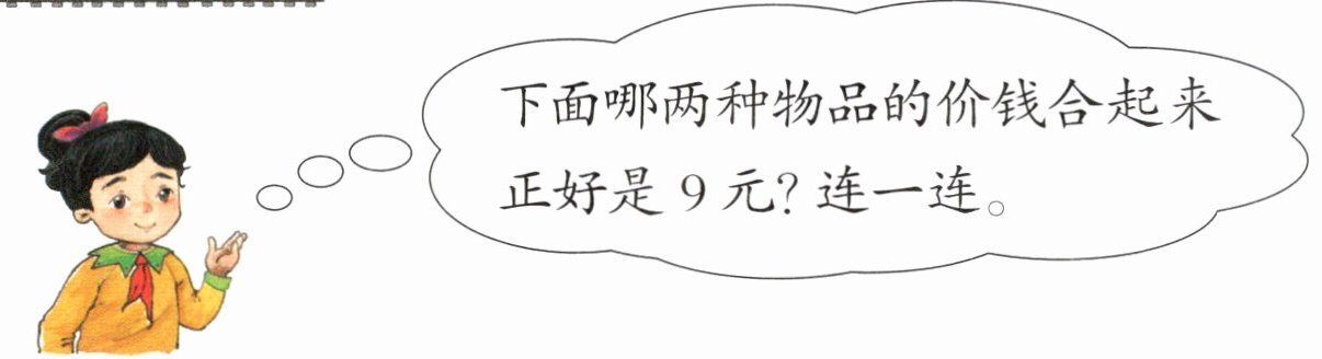 下面哪两种物品的价钱合起来正好是 9 元?连一连。