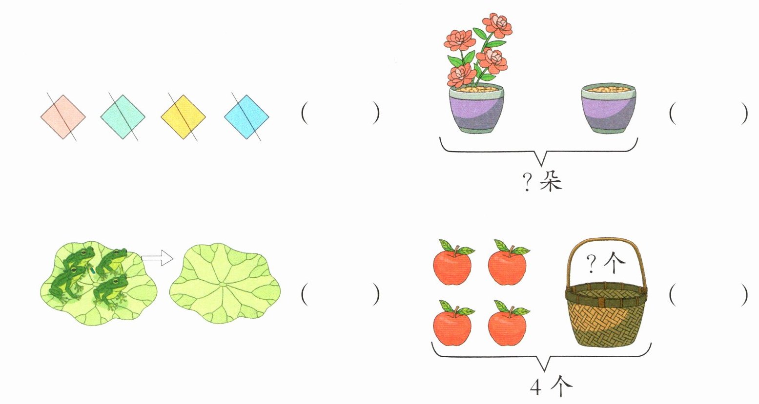 仔细分辨,下面哪一幅图不能用算式“$4-4=0$”表示,在图后面的括号里打“√”。