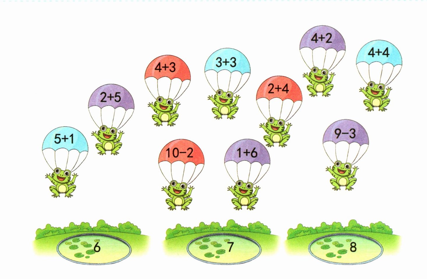 2. 小青蛙正在进行大练兵。算一算,小青蛙各跳进哪个水池?连一连。