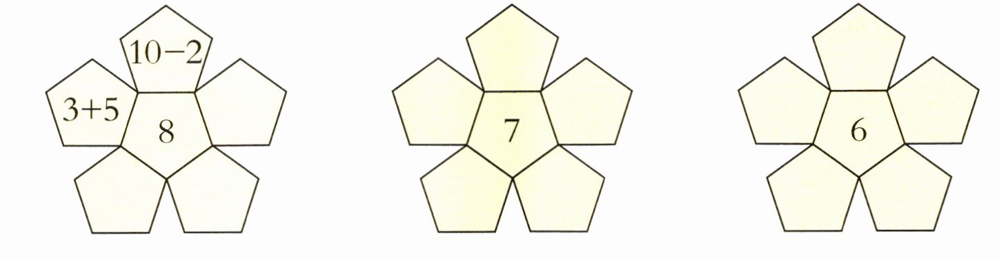 照样子,看得数写算式,看看每个花瓣里藏着什么算式。