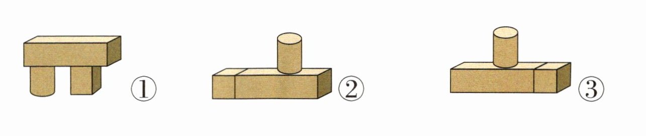 2. 在长方体的右边摆一个正方体,在长方体的上面摆一个圆柱。下面( )摆法是正确的。