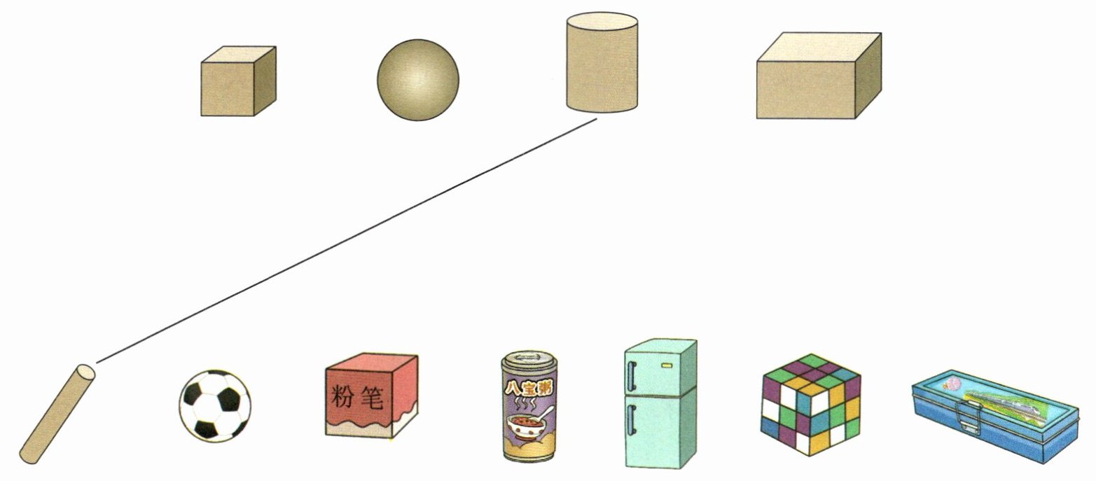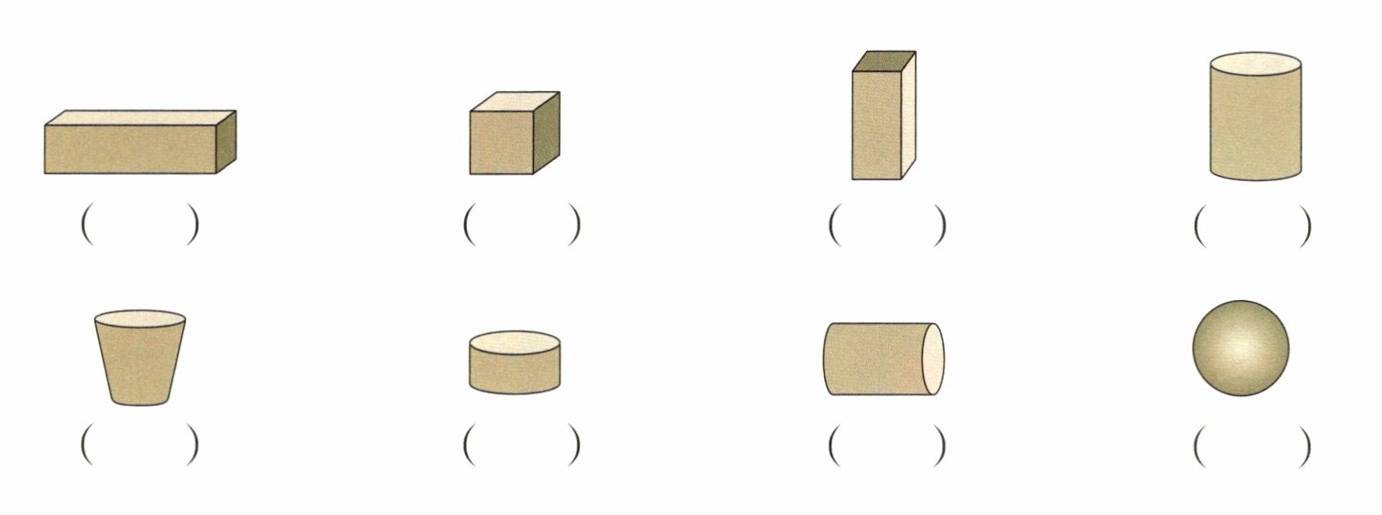 一、在长方体下面打“√”,在正方体下面打“×”,在圆柱下面画“≡”在球下面画“//”。(8 分)