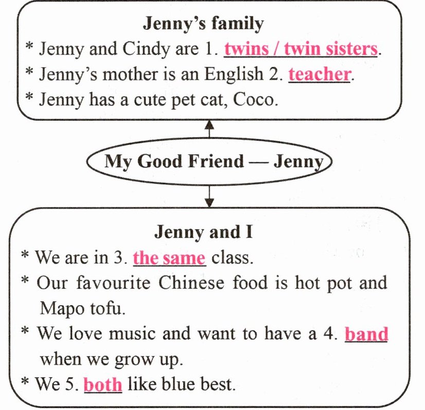 Jenny’s family * Jenny and Cindy are 1. twins / twin sisters. * Jenny’s mother is an English 2. teacher. * Jenny has a cute pet cat, Coco. My Good Friend — Jenny Jenny and I * We are in 3. the same class. * Our favourite Chinese food is hot pot and Mapo tofu. * We love music and want to have a 4. band when we grow up. * We 5. both like blue best.