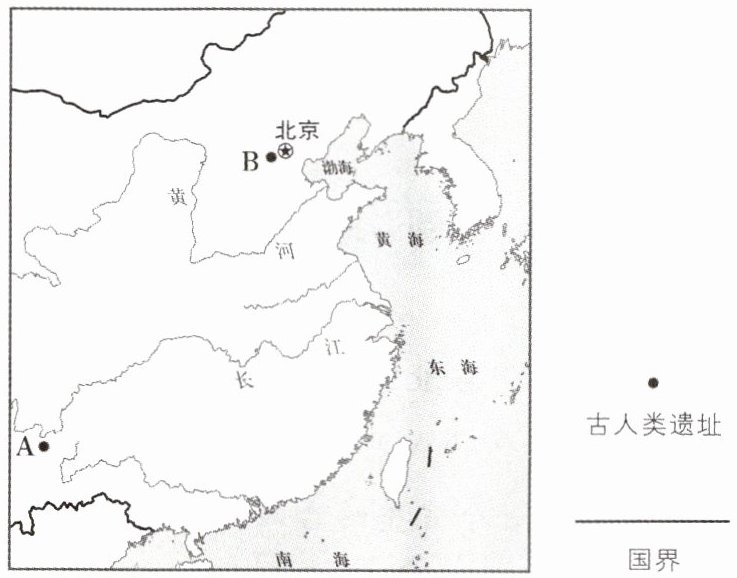 A:元谋人,距今约170万年;B:北京人,距今约70万—20万年。