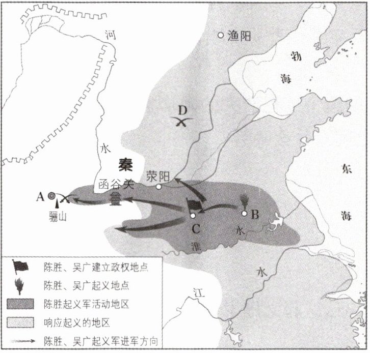 (1) 秦朝的都城 A 是______;农民起义的爆发地 B 是______;农民政权建立地点 C 是______;所建立的政权名称是______;歼灭秦军主力的战役地点 D 是______,战役名称是______。