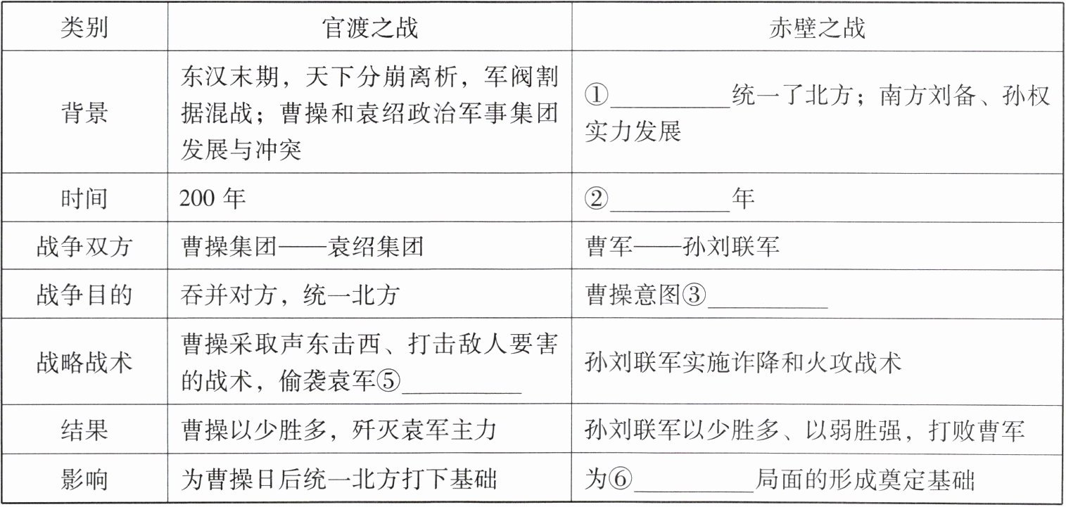 |背景|东汉末期,天下分崩离析,军阀割据混战;曹操和袁绍政治军事集团发展与冲突|①____统一了北方;南方刘备、孙权实力发展|