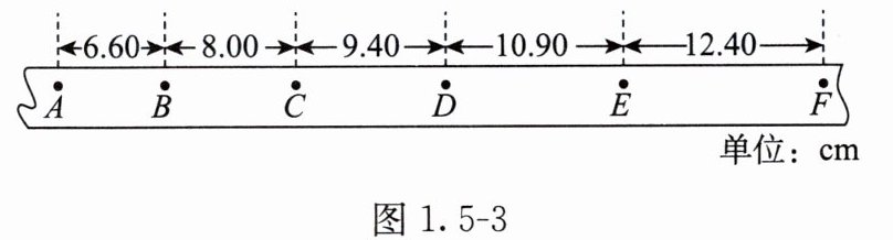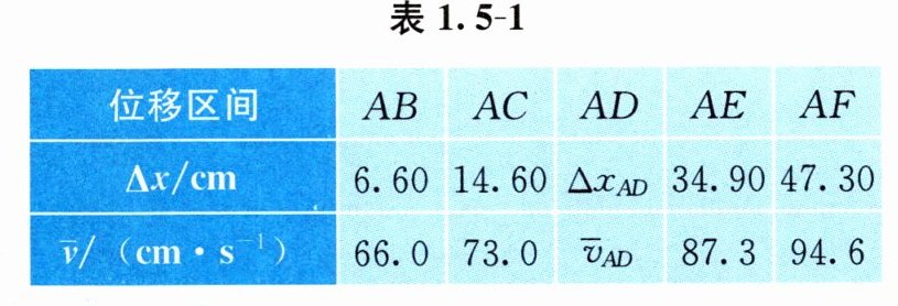 4. (2023·全国甲卷·改编)某次实验得到的纸带和相关数据如图1.5-3所示,纸带中相邻两个计数点的时间间隔均为0.1s,以打出$ A $点时物体位置为初始位置,将打出$ B $、$ C $、$ D $、$ E $、$ F $各点时物体的位移$ \Delta x $填到表1.5-1中,物体发生对应位移和平均速度分别为$ \Delta x $和$ \overline{v} $,表中$ \Delta x_{AD} = $