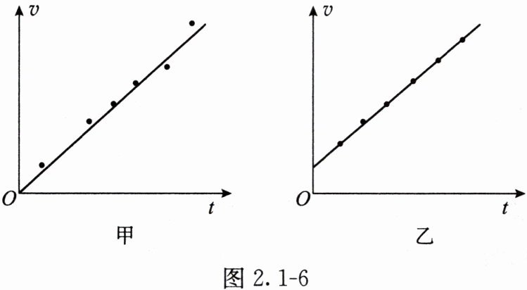 1. 图 $ 2.1 - 6 $ 中甲、乙两个图像分别为 A、B 两位同学从实验中得到数据后画出的小车运动 $ v - t $ 图像。