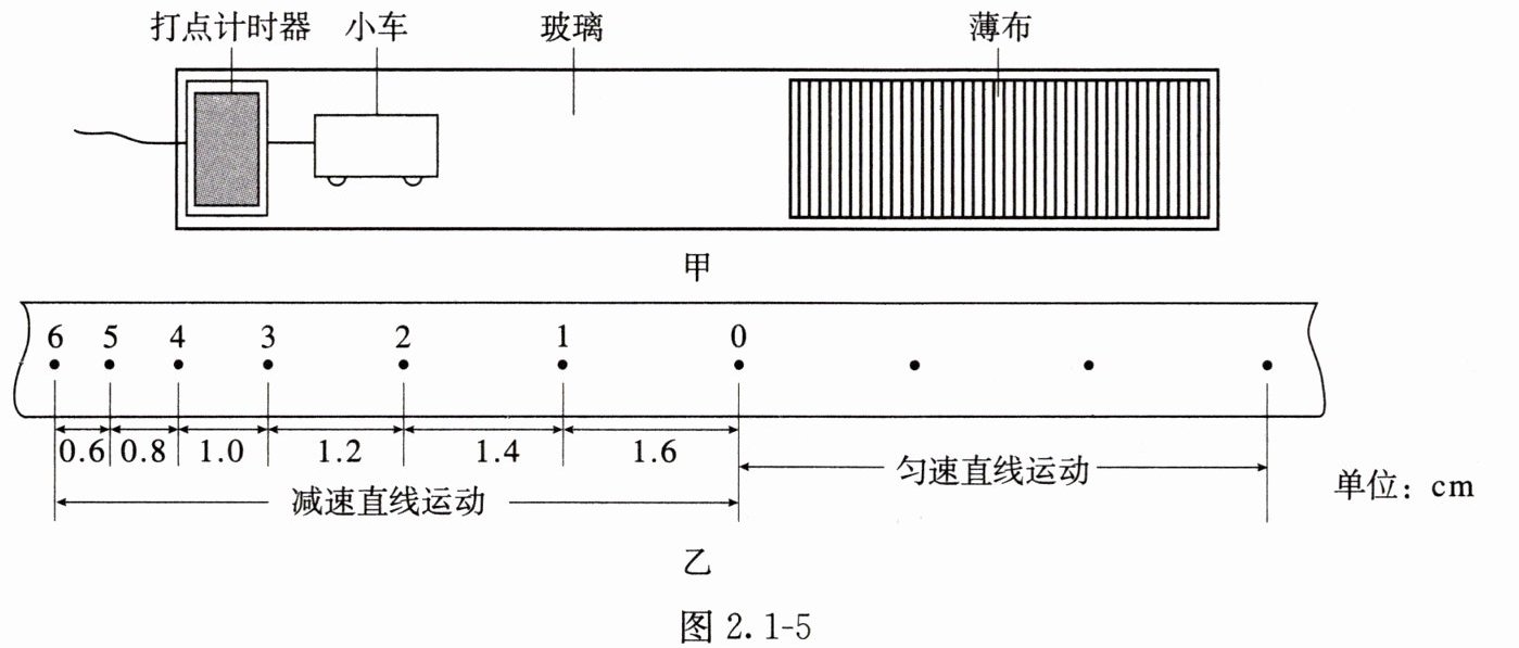 5. 如图 $ 2.1 - 5 $ 甲所示,用打点计时器记录小车的运动情况。小车开始在水平玻璃板上运动,后来在薄布面上做减速直线运动。所打出的纸带及相邻两点间的距离如图 $ 2.1 - 5 $ 乙所示,纸带上相邻两点对应的时间间隔为 $ 0.02 \, s $。试用作图法($ v - t $ 图像)求出小车在玻璃板上运动的速度。