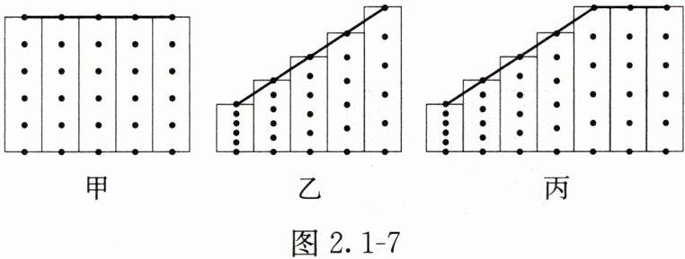 2. (多选)在用打点计时器研究物体的速度随时间变化的规律实验中,某同学将打点计时器打出的三条纸带分别以间隔相同点迹的方式依次剪成短纸条,按先后顺序于一端对齐粘贴在一起。然后用平滑线段将各段纸带顶端的点连起来,如图 $ 2.1 - 7 $ 所示,根据纸带的特点即可研究物体的速度随时间变化的规律。下列说法正确的是(