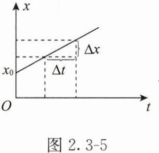 若在 $ t = 0 $ 时,$ x = x_{0} $,则 $ x - t $ 图像中的图线为一条纵轴截距为 $ x_{0} $ 的倾斜的直线,如图 2.3 - 5 所示。图线的斜率表示物体运动的速度,有 $ v = \frac{\Delta x}{\Delta t} $。