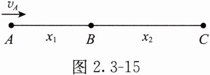 例题 2 有一个做匀变速直线运动的质点,它在两段连续相等的时间内通过的位移分别为 $ x_{1} = 24 \, m $ 和 $ x_{2} = 64 \, m $,如图 2.3 - 15 所示,连续相等的时间为 $ t = 4 \, s $,求质点的初速度 $ v_{A} $ 和加速度 $ a $ 的大小。
