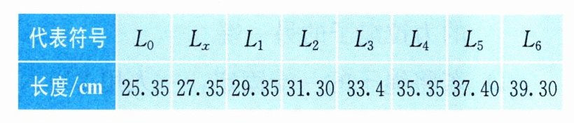 时,长度记为$L_0$;弹簧下端挂上砝码盘时,长度记为$L_x$;在砝码盘中每次增加$10\ g$砝码,弹簧长度依次记为$L_1 \sim L_6$,数据如表 3.1 - 1 所示。表中有一个数值记录不规范,代表符号为