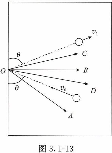 5. 台球以速度$v_0$与球桌边框的长边成$\theta$角撞击$O$点,反弹后速度为$v_1$,方向与球桌边框的长边夹角仍为$\theta$(如图 3.1 - 13 所示),$OB$垂直于球桌边框的长边。下列关于桌边框对小球的弹力方向的判断中,正确的是(