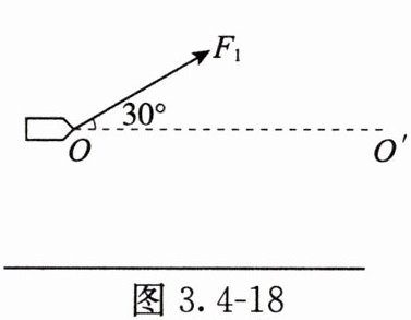 7. 甲、乙两人沿平直的河岸拉一条小船前进。已知甲的拉力 $ F_1 = 200 \, N $,方向如图 3.4 - 18 所示。要使船沿着与河岸平行的直线航道行驶,则乙对船施加的最小拉力为多大? 方向怎样?