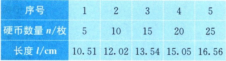 (2)将硬币以 $ 5 $ 枚为一组逐次加入塑料袋,测量每次稳定后橡皮条的长度 $ l $,记录数据如表 3.6 - 1 所示。
