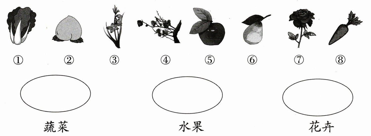 三、下面的物品怎样分类?请把序号填在不同的圈里。(8分)