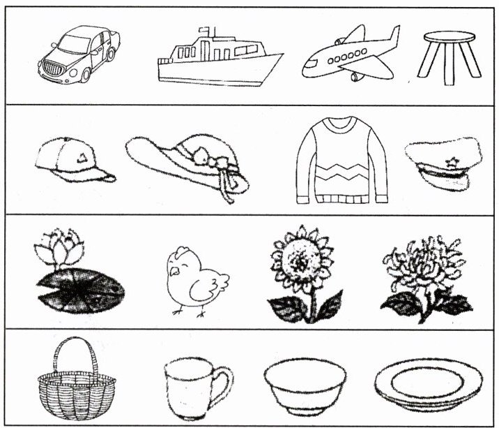 十、把每行中不同类的圈出来。(8分)