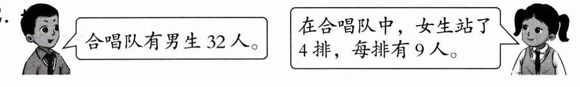 2. 合唱队有男生32人。在合唱队中,女生站了4排,每排有9人。