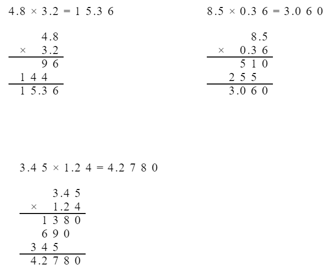 $4.8 × 3.2 =$ $8.5 × 0.36 =$ $3.45 × 1.24 ≈$