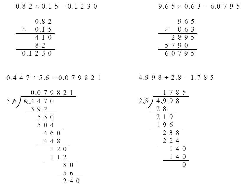 $0.4 × 0.04 =$ $0.8 × 0.9 =$ $1.5 × 0.6 =$ $4 × (0.25 + 25) =$