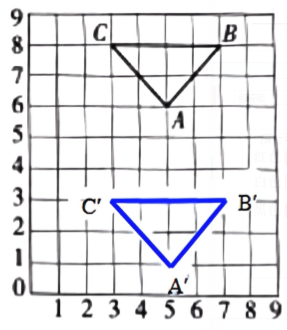 2. 画出三角形$ABC$向下平移$5$格后的图形,并标出各个顶点$A'$、$B'$、$C'$,再用数对表示$A'$、$B'$、$C'$的位置。