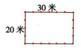 3.某小区有一个长方形花园(如图)。现在要在花园的四周栽树,$4$个角上都要栽,每相邻两棵树间隔$5$米。一共要栽多少棵树?(用“·”表示树的位置,先在图中画一画,再计算。)(4分)