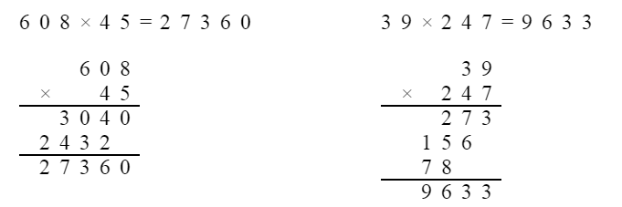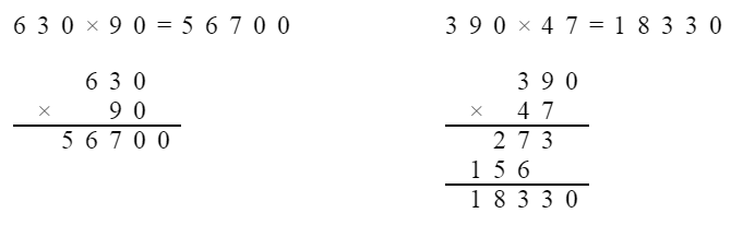 $ 390 × 47 = $ $ 608 × 45 = $ $ 39 × 247 = $