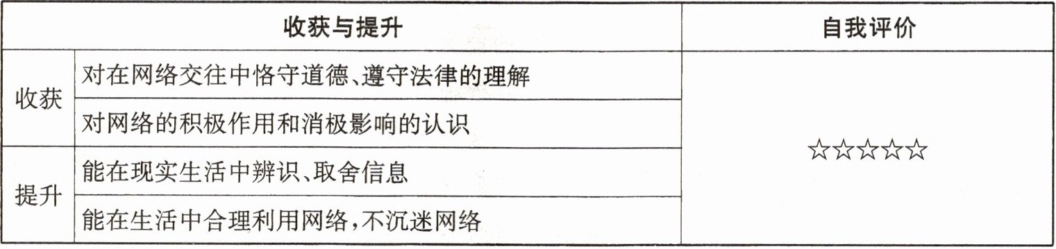 | 收获 | 对在网络交往中恪守道德、遵守法律的理解 | ☆☆☆☆☆ |