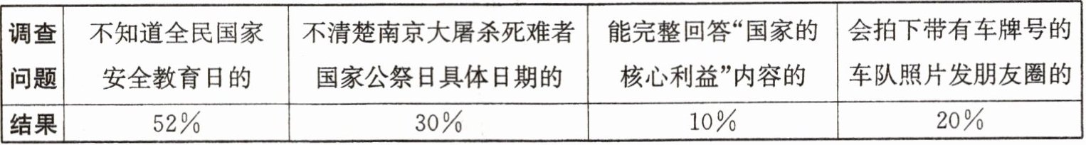 |调查问题|不知道全民国家安全教育日的|不清楚南京大屠杀死难者国家公祭日具体日期的|能完整回答“国家的核心利益”内容的|会拍下带有车牌号的车队照片发朋友圈的|
