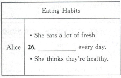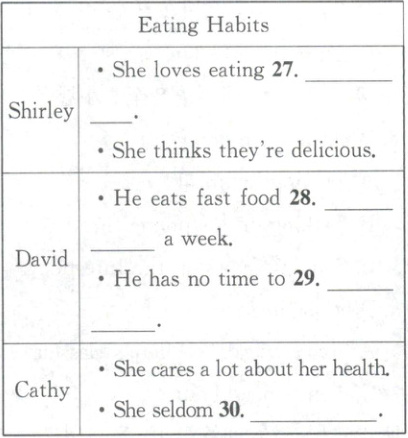 26. fruit and vegetables 27. sweet food 28. four times 29. cook meals 30. eats out