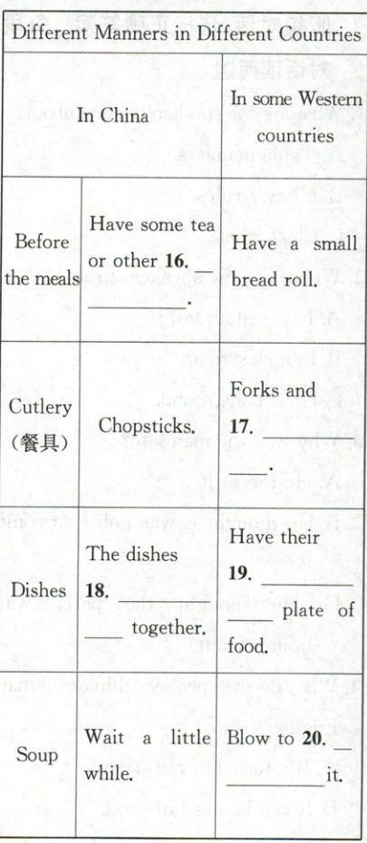 16. drinks 17. knives 18. are placed 19. own 20. cool