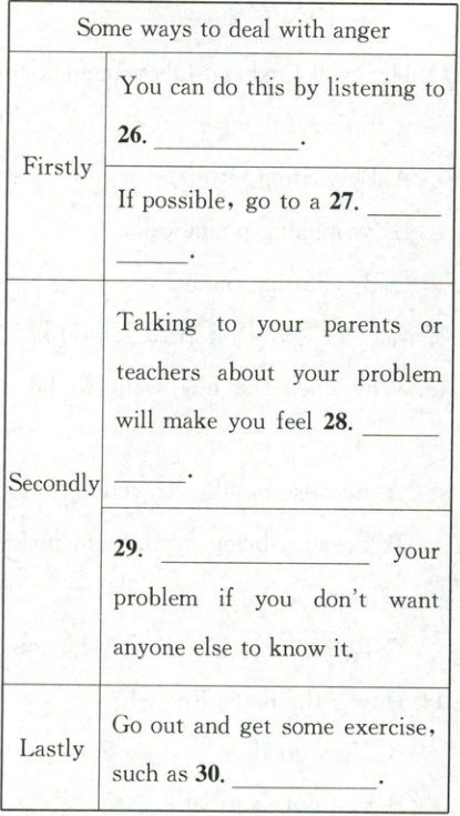 26. peaceful music 27. quiet place 28.a lot better 29. Write down 30. running or swimming