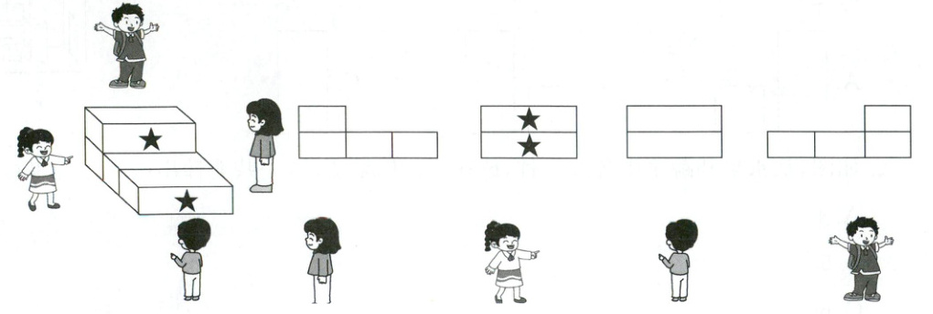 从左到右,第一个小朋友看到的是有两颗星的面,与第四个图形相连;