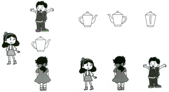 从右面小女孩的位置看,看到茶壶的壶嘴在右侧,应连第一个图;