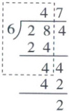 3. 把284个乒乓球装进盒子,每个盒子装6个,要装多少盒?淘淘列竖式计算,图中虚线框出的部分表示(
