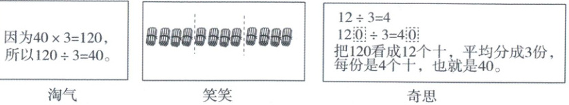 1. 三位同学在思考如何计算$120÷ 3$,他们的想法如下: